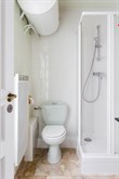 When you open the doors to Le Pasteur you will be pleasantly surprised by a well-lit living room decorated in purple and white.  The couch is situated in front of a flat-screen TV, and you have wifi internet access throughout the apartment.  The accommodation is ideal for 2 to 4 guests with a double bedroom and a comfortable fold-out couch in the living room.  There is also an American-style kitchen that is fully equipped for at-home cooking, and a dining table where you can enjoy your meals together.  In the bedroom you will find a double bed and plenty of space to organize your belongings.  Finally, the bathroom has a shower, sink and toilet.
